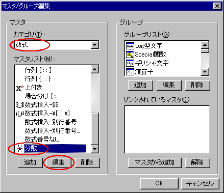 マスタカテゴリ「数式」の「分数」を選択して「編集」ボタンを押す